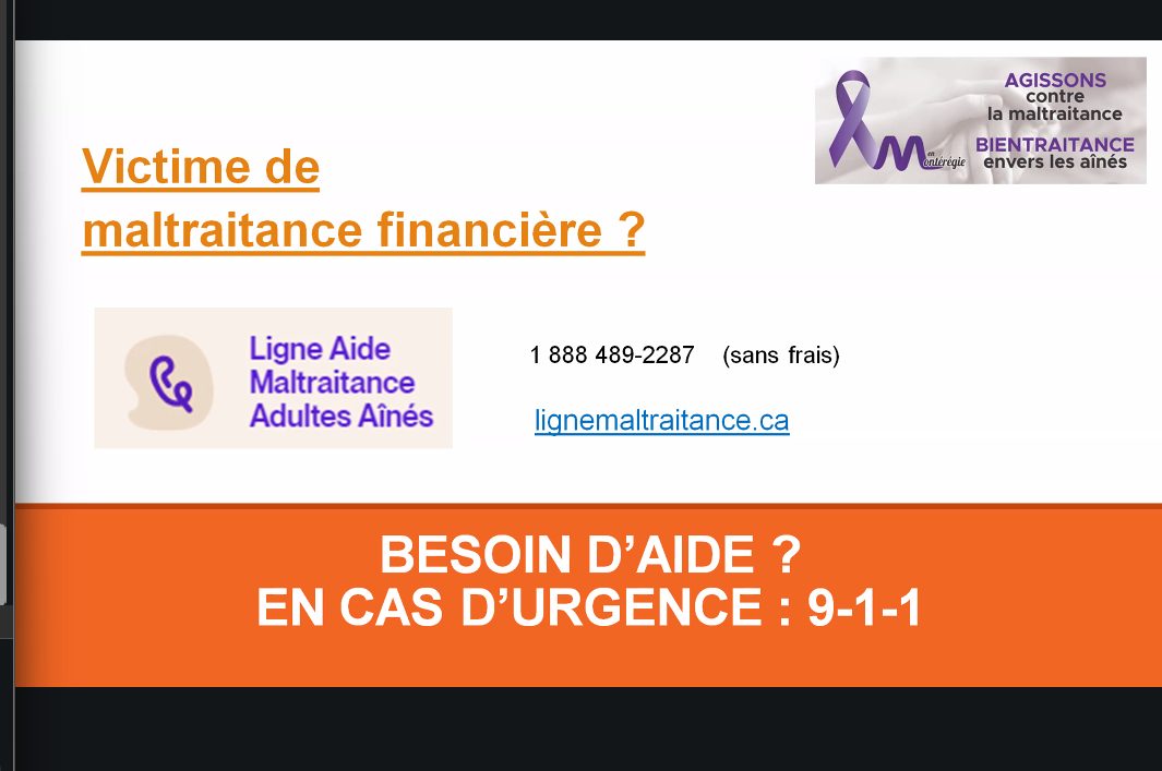 Vous avez été nombreux à assister à cette présentation, offerte dans le cadre du programme Aîné-Avisé, visant à aider les personnes aînées à reconnaître les signes de fraude, comprendre les stratagèmes utilisés et apprendre comment mieux se protéger.